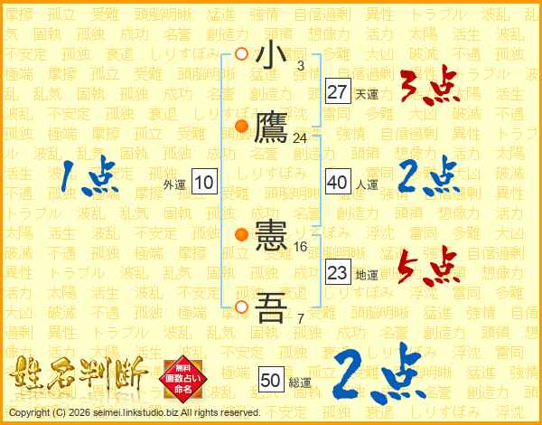 小(3画)鷹(24画) 憲(16画)吾(7画)