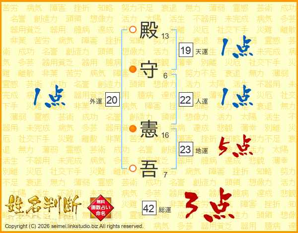 殿(13画)守(6画) 憲(16画)吾(7画)