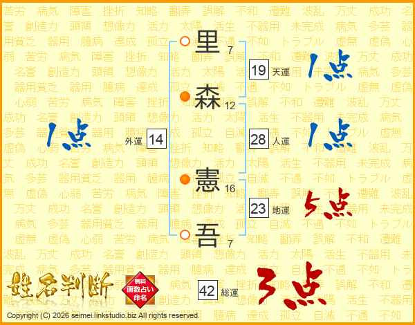 生活面を象徴する運勢です。外部から受ける影響力を表し、結婚運、家庭運や職場、環境への順応性を表します。総運から人運を引いた画数。姓や名が1文字の場合を除く。