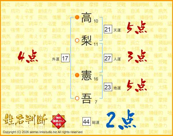 高(10画)梨(11画) 憲(16画)吾(7画)