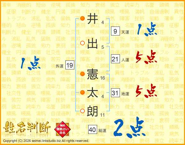 井(4画)出(5画) 憲(16画)太(4画)朗(11画)