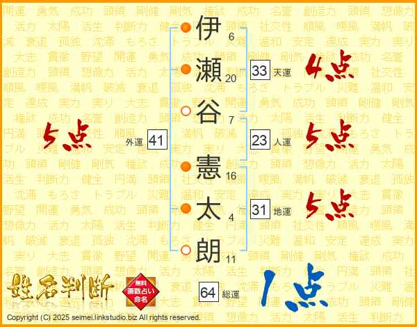 伊(6画)瀬(20画)谷(7画) 憲(16画)太(4画)朗(11画)