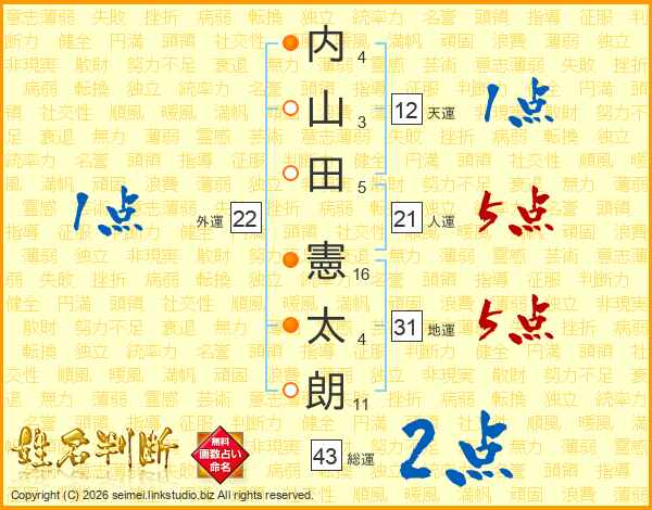 内(4画)山(3画)田(5画) 憲(16画)太(4画)朗(11画)