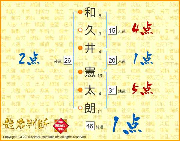 和(8画)久(3画)井(4画) 憲(16画)太(4画)朗(11画)
