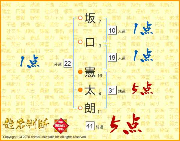 坂(7画)口(3画) 憲(16画)太(4画)朗(11画)