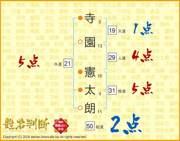 寺(6画)園(13画) 憲(16画)太(4画)朗(11画)