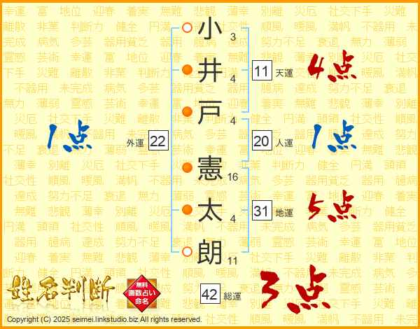 小(3画)井(4画)戸(4画) 憲(16画)太(4画)朗(11画)