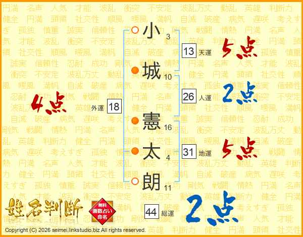 小(3画)城(10画) 憲(16画)太(4画)朗(11画)