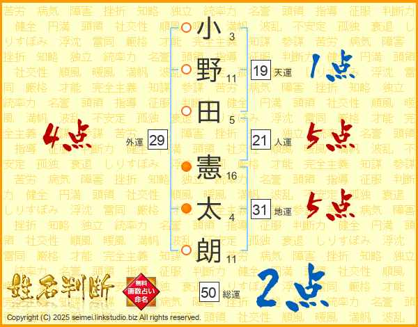 小(3画)野(11画)田(5画) 憲(16画)太(4画)朗(11画)