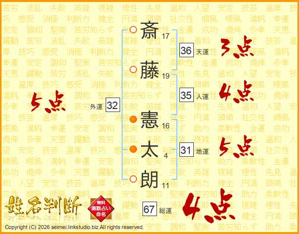 斎(17画)藤(19画) 憲(16画)太(4画)朗(11画)