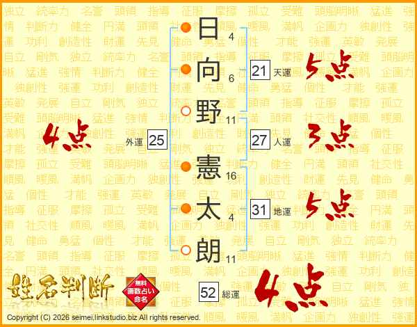 日(4画)向(6画)野(11画) 憲(16画)太(4画)朗(11画)