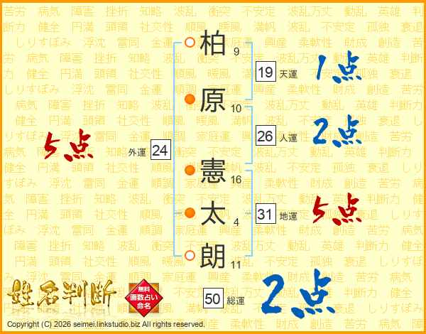 柏(9画)原(10画) 憲(16画)太(4画)朗(11画)