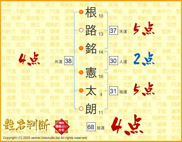 根(10画)路(13画)銘(14画) 憲(16画)太(4画)朗(11画)