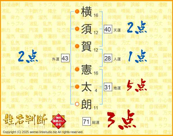 横(16画)須(12画)賀(12画) 憲(16画)太(4画)朗(11画)
