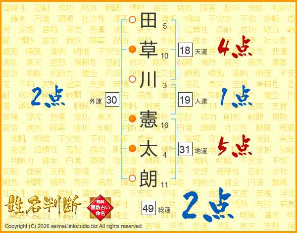 田(5画)草(10画)川(3画) 憲(16画)太(4画)朗(11画)