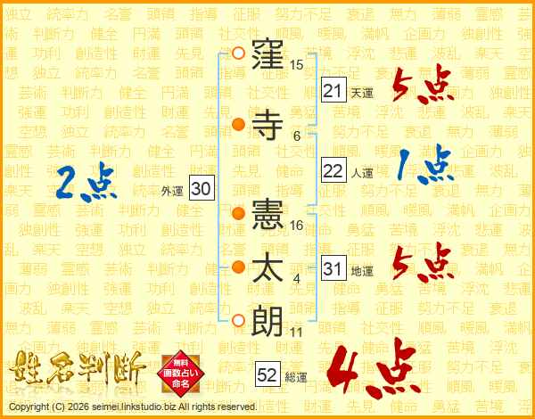 窪(15画)寺(6画) 憲(16画)太(4画)朗(11画)