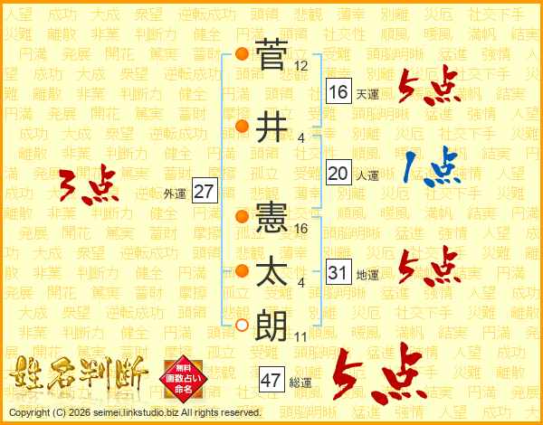 菅(12画)井(4画) 憲(16画)太(4画)朗(11画)