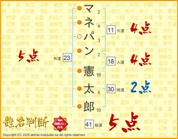 マ(2画)ネ(4画)パ(3画)ン(2画) 憲(16画)太(4画)郎(10画)