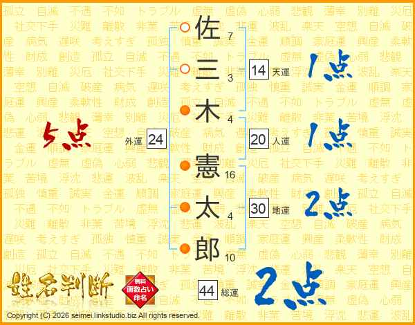 佐三木憲太郎さんの総運は44画の2点!