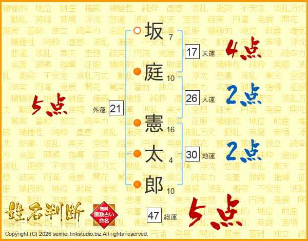 坂庭憲太郎さんの総運は47画の5点!