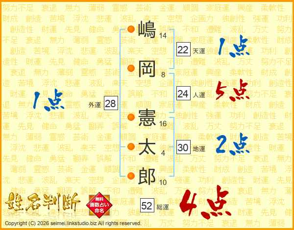 嶋(14画)岡(8画) 憲(16画)太(4画)郎(10画)