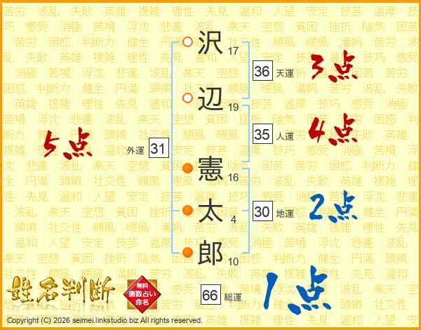 沢辺憲太郎さんの総運は66画の1点!