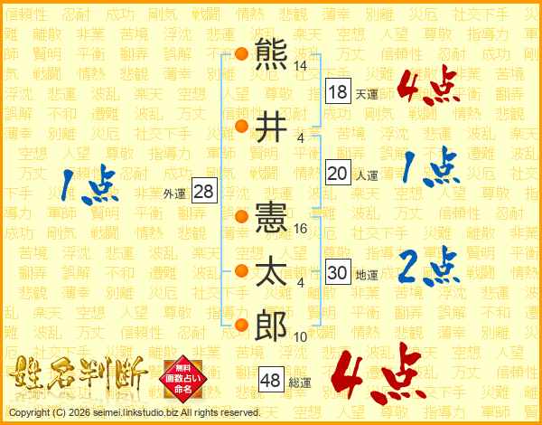 熊(14画)井(4画) 憲(16画)太(4画)郎(10画)
