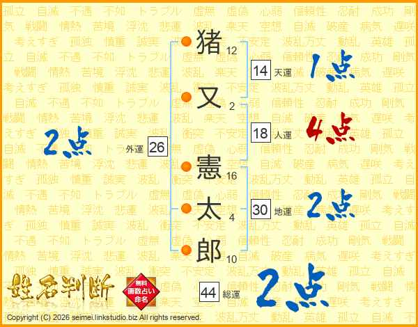 猪(12画)又(2画) 憲(16画)太(4画)郎(10画)