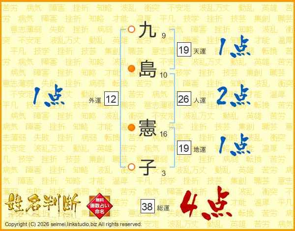 九(9画)島(10画) 憲(16画)子(3画)