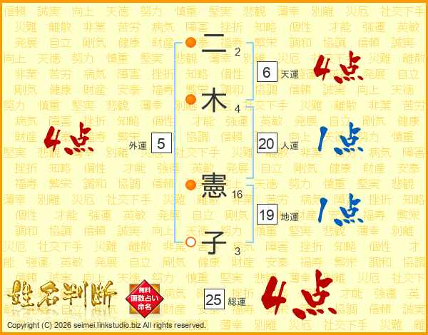 生活面を象徴する運勢です。外部から受ける影響力を表し、結婚運、家庭運や職場、環境への順応性を表します。総運から人運を引いた画数。姓や名が1文字の場合を除く。