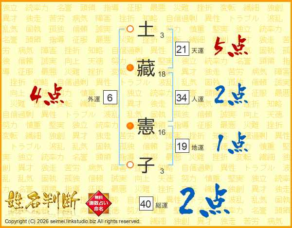 土(3画)藏(18画) 憲(16画)子(3画)