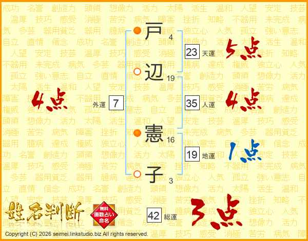 戸(4画)辺(19画) 憲(16画)子(3画)
