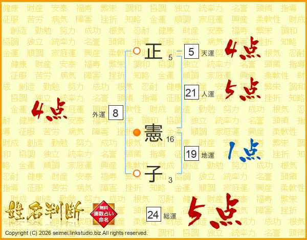 あなたの人生を表す1番重要な運勢です。生涯を通じて影響する総合運となり、主に50歳以降の晩年期に影響を及ぼします。苗字と名前の合計画数。