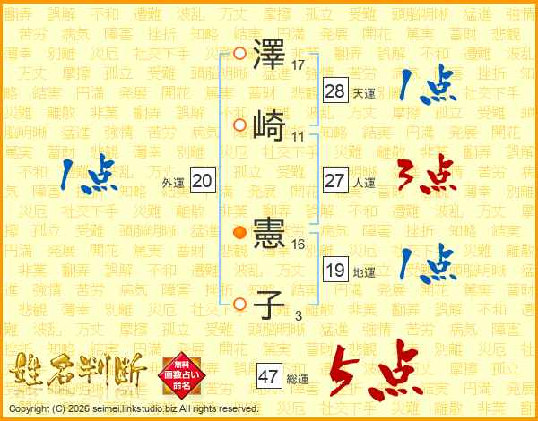澤(17画)崎(11画) 憲(16画)子(3画)