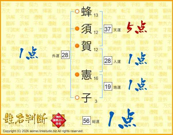 蜂(13画)須(12画)賀(12画) 憲(16画)子(3画)