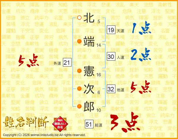 北(5画)端(14画) 憲(16画)次(6画)郎(10画)