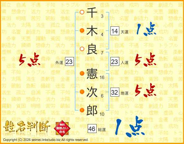 千(3画)木(4画)良(7画) 憲(16画)次(6画)郎(10画)