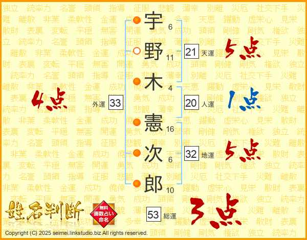 宇(6画)野(11画)木(4画) 憲(16画)次(6画)郎(10画)