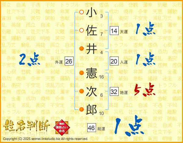 小佐井憲次郎さんの総運は46画の1点!