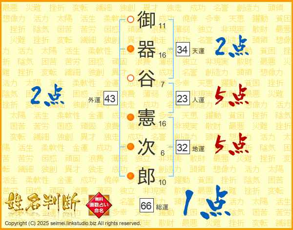 御(11画)器(16画)谷(7画) 憲(16画)次(6画)郎(10画)