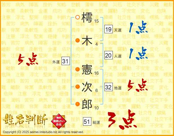 樗(15画)木(4画) 憲(16画)次(6画)郎(10画)