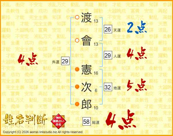 渡(13画)會(13画) 憲(16画)次(6画)郎(10画)