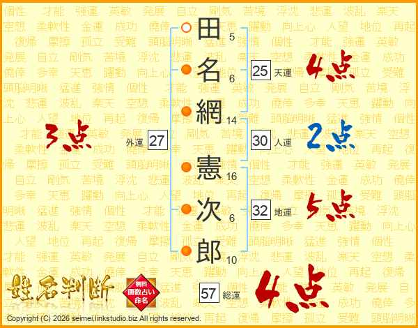 田(5画)名(6画)網(14画) 憲(16画)次(6画)郎(10画)