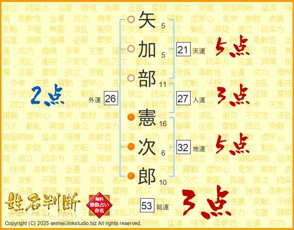 矢(5画)加(5画)部(11画) 憲(16画)次(6画)郎(10画)