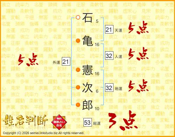 石(5画)亀(16画) 憲(16画)次(6画)郎(10画)