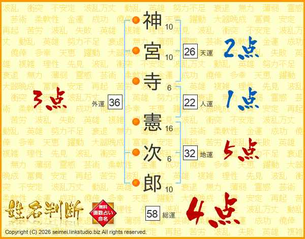 神(10画)宮(10画)寺(6画) 憲(16画)次(6画)郎(10画)