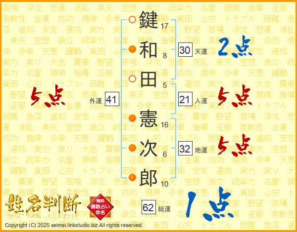 鍵(17画)和(8画)田(5画) 憲(16画)次(6画)郎(10画)