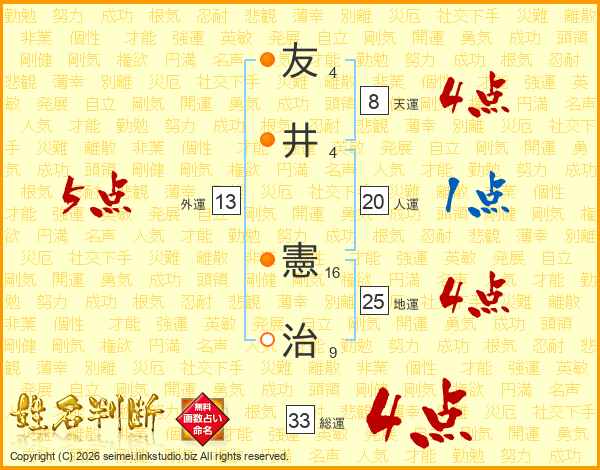 友(4画)井(4画) 憲(16画)治(9画)