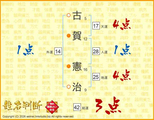 生活面を象徴する運勢です。外部から受ける影響力を表し、結婚運、家庭運や職場、環境への順応性を表します。総運から人運を引いた画数。姓や名が1文字の場合を除く。