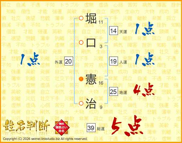 堀(11画)口(3画) 憲(16画)治(9画)